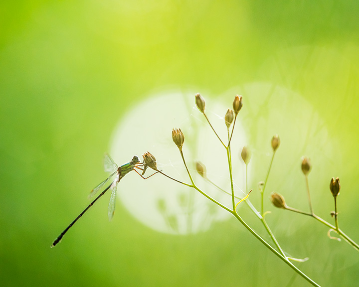 Een mooi model in groen, geel en bruin metallic. Glazen vleugels houden het in de lucht. Zoekend naar de beste zonnestralen van de wereld om te glanzen in het licht. Sierlijk vliegend met een keiharde naam. Houtpantserjuffer.