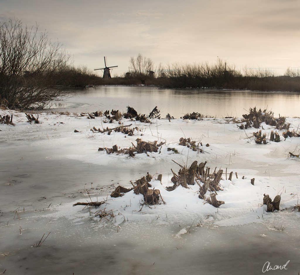 Net toen ik zag dat de eerste narcissen en krokussen hun groene bladeren ruim boven de grond hadden uitgestoken en aanstalten maakten om te gaan bloeien gooide moeder Natuur een dikke laag witte structuurverf om alles glad te strijken. De ijzige koude oostenwind versteende het water tot een gladde, harde massa en liet ons achter in een nieuw, met witte tinten, gevuld landschap.